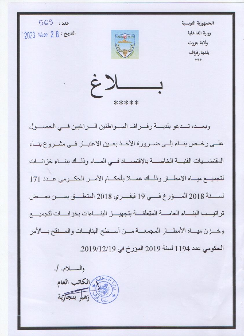 بلاغ إلى المواطنين الراغبين في الحصول على رخصة بناء بلدية رفراف 08 أوت 2023 الزيارات: 217 Facebook Twitter السابق التالي